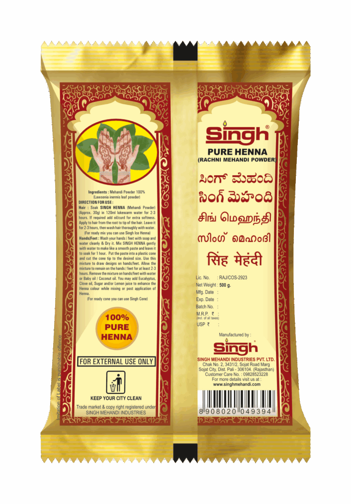 Quality Information: Singh Mehandi powder is manufactured from selected natural mehandi leaves to give natural mehandi color. It doesn’t contain any chemical or coloring agent.